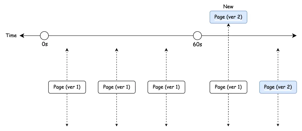 여기서 주의할점은 설정 시간이 지난 다음에 들어온 첫 번째 요청에서 바로 페이지를 생성해 응답하는 것이 아니라는 점이다. 대신 이미 생성된 페이지로 빠르게 응답함과 동시에 한편에서는 백그라운드에서 최신 데이터를 반영해 다시 페이지를 생성한다. 이렇게 동작하는 까닭은 사용자가 페이지를 아무 때나 요청하더라도 언제든지 정적 페이지로 빠르게 응답하기 위함이다.