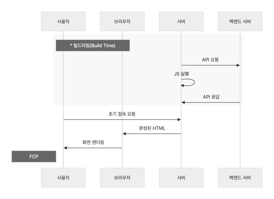 위 그림처럼 프로젝트의 빌드 타임에 미리 사전 렌더링을 진행한다. 프로젝트가 가동되고 접속 요청이 발생하면 미리 생성해 둔 페이지로 지연 없이 바로 응답한다.
